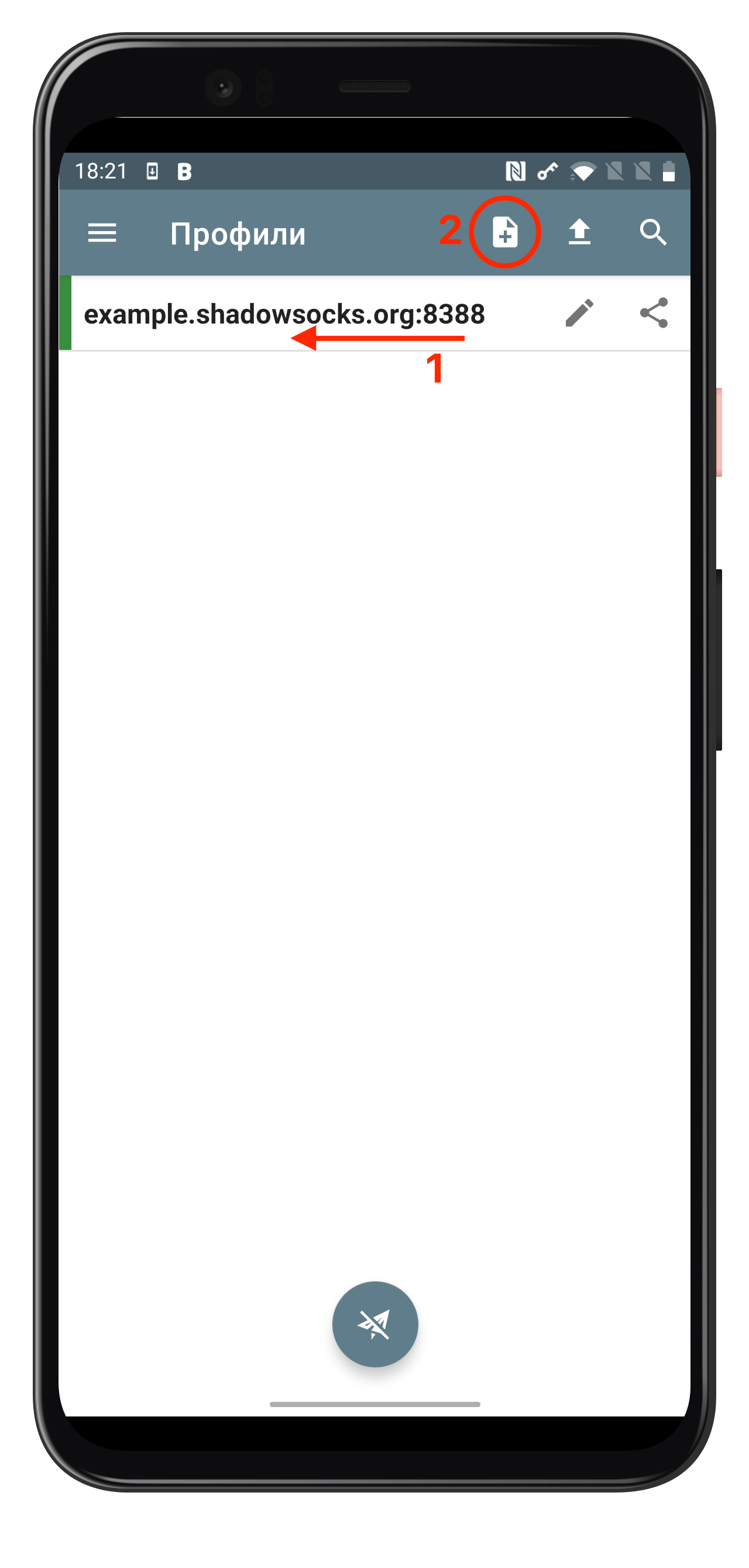 Наверху вы увидите тестовый сервер «example.shadowsocks.org» – смахните влево, чтобы удалить его.