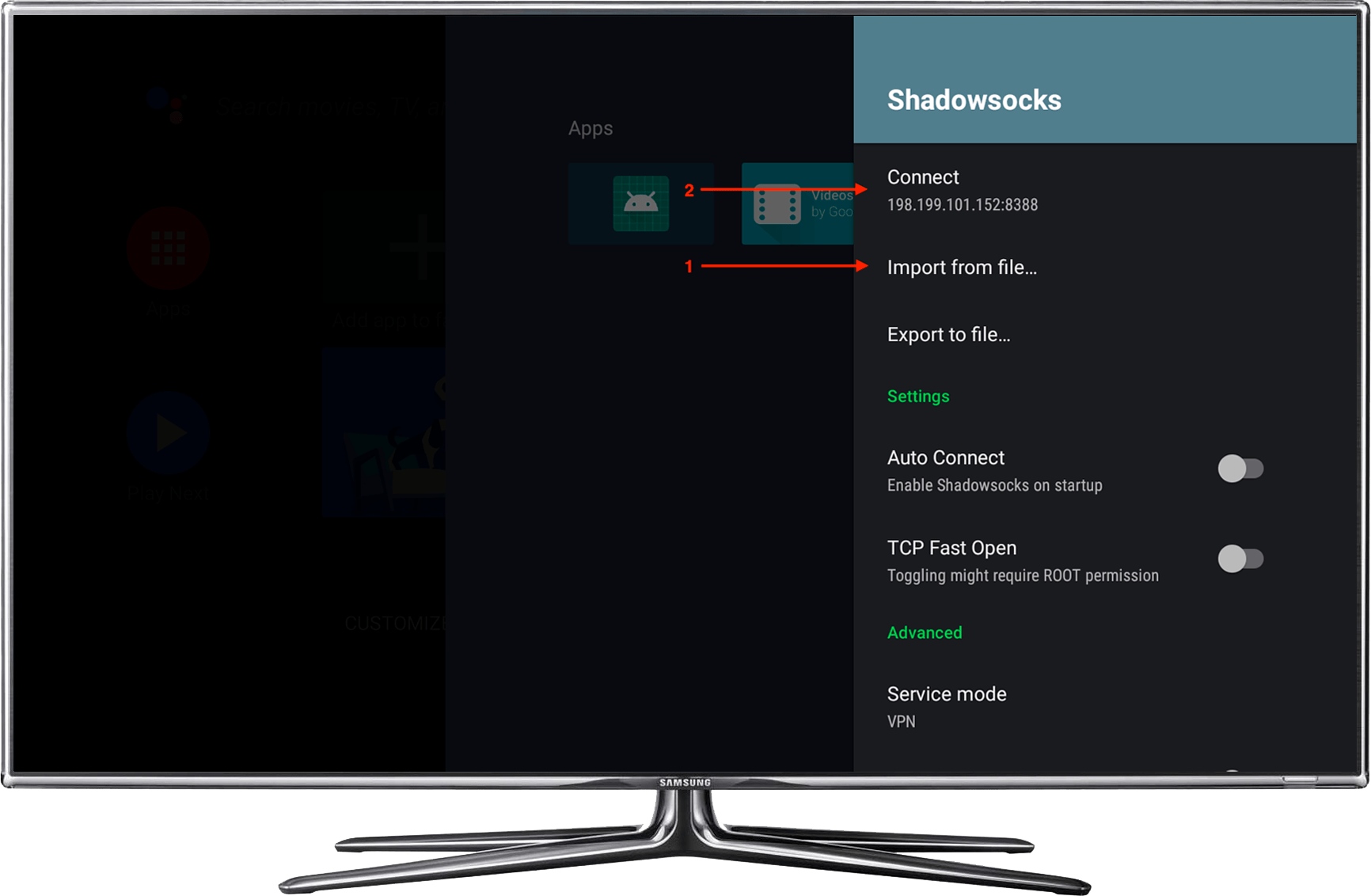На телевизоре скачайте два приложения: Shadowsocks (так же можете скачать напрямую .APK) и File Commander.