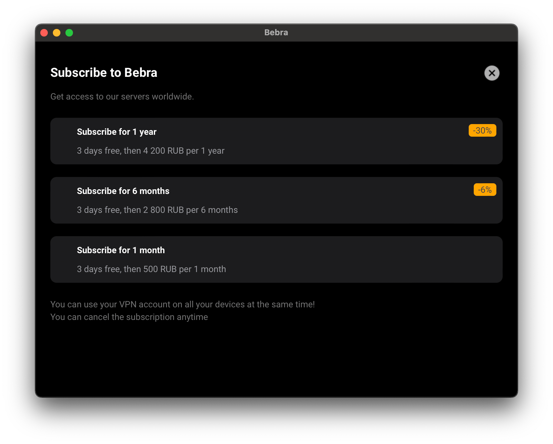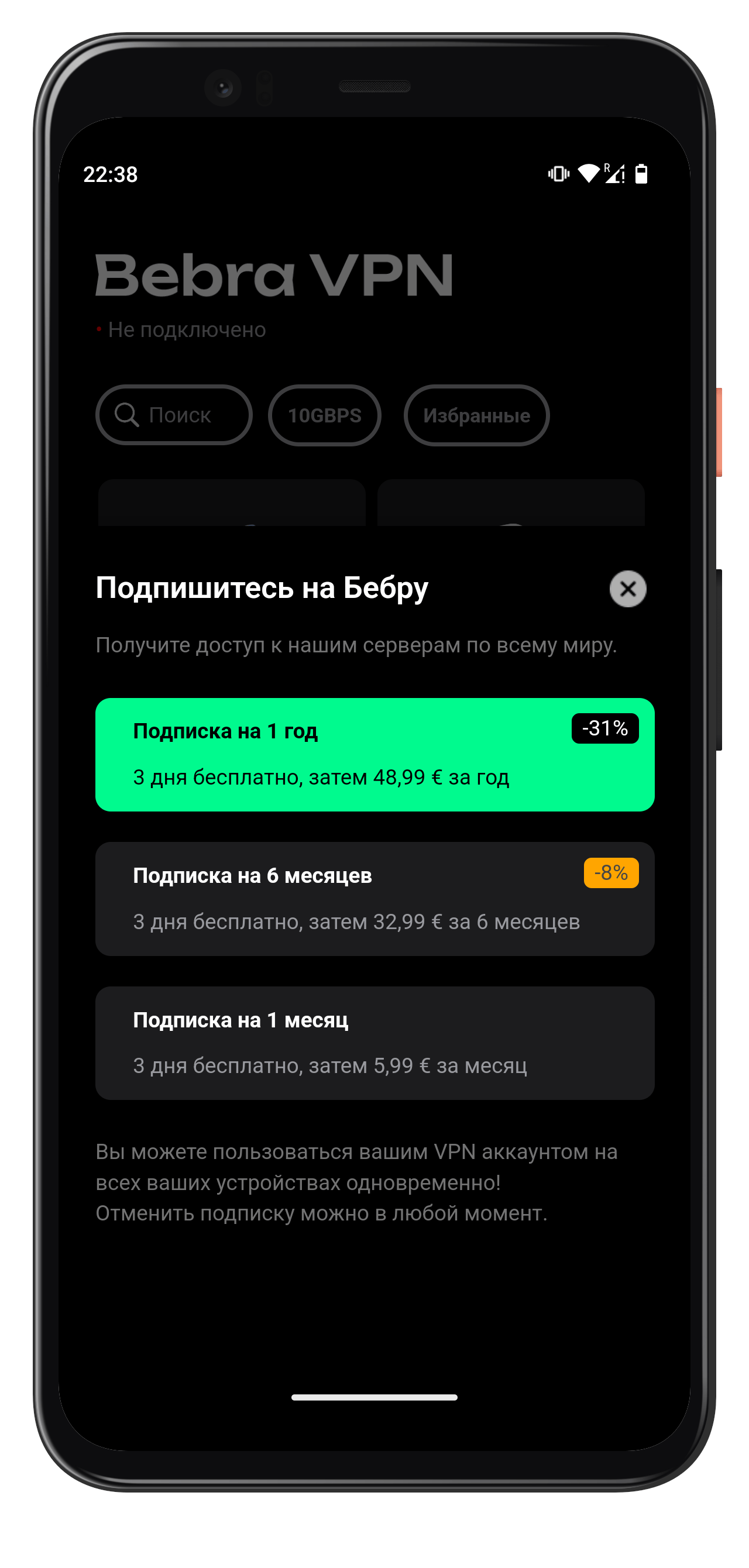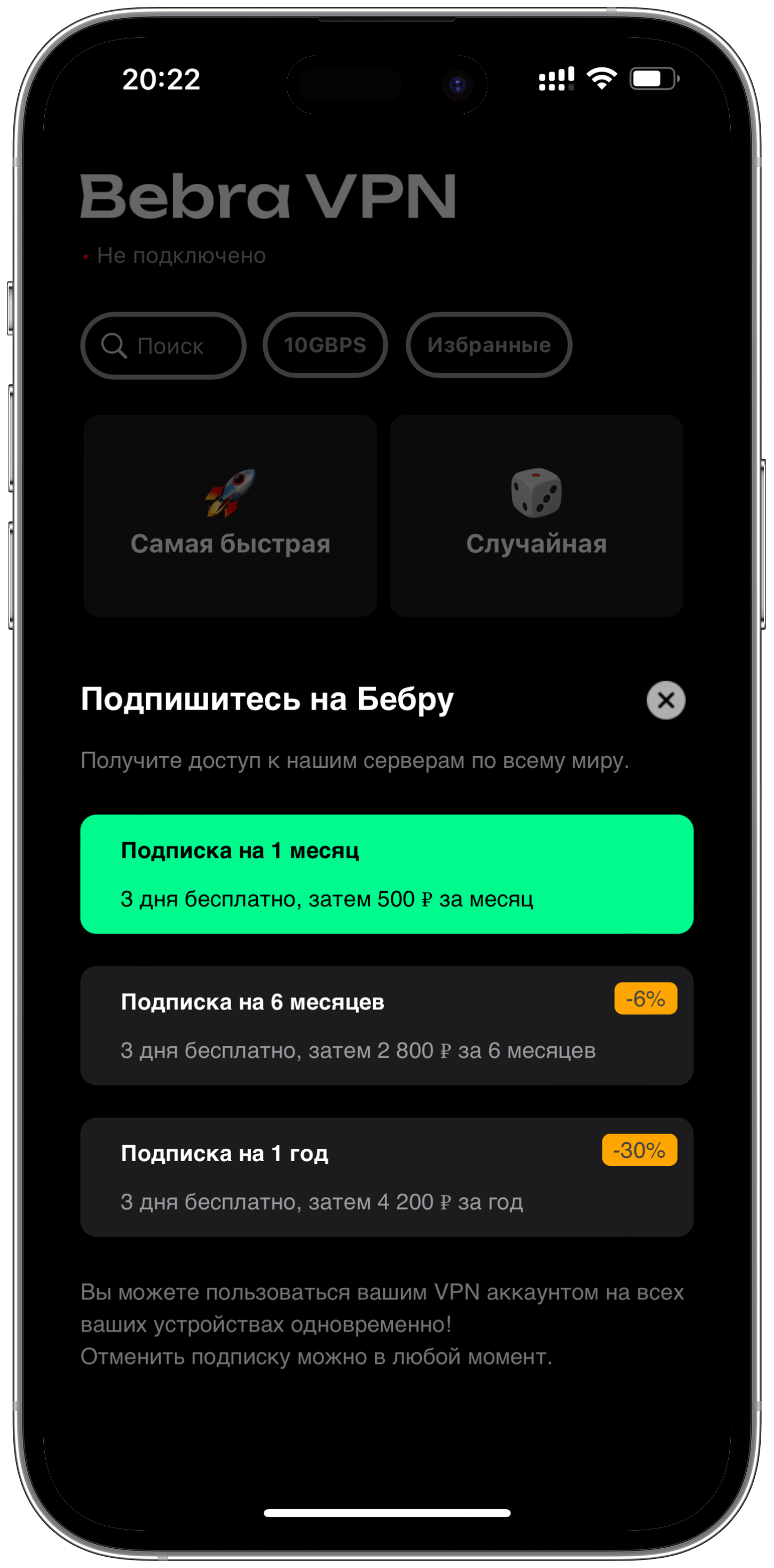 Поскольку App Store и Google Play отключили оплату российскими картами, мы сделали для вас возможность оплатить через наш сайт https://bebra.pw.