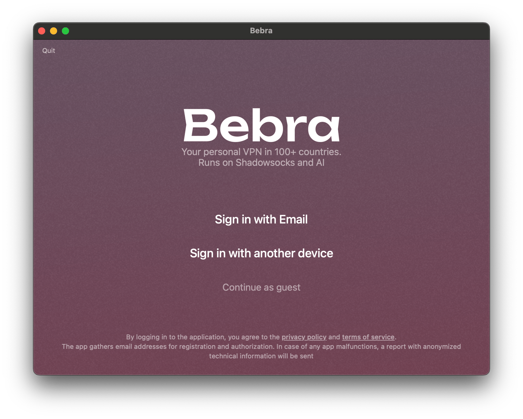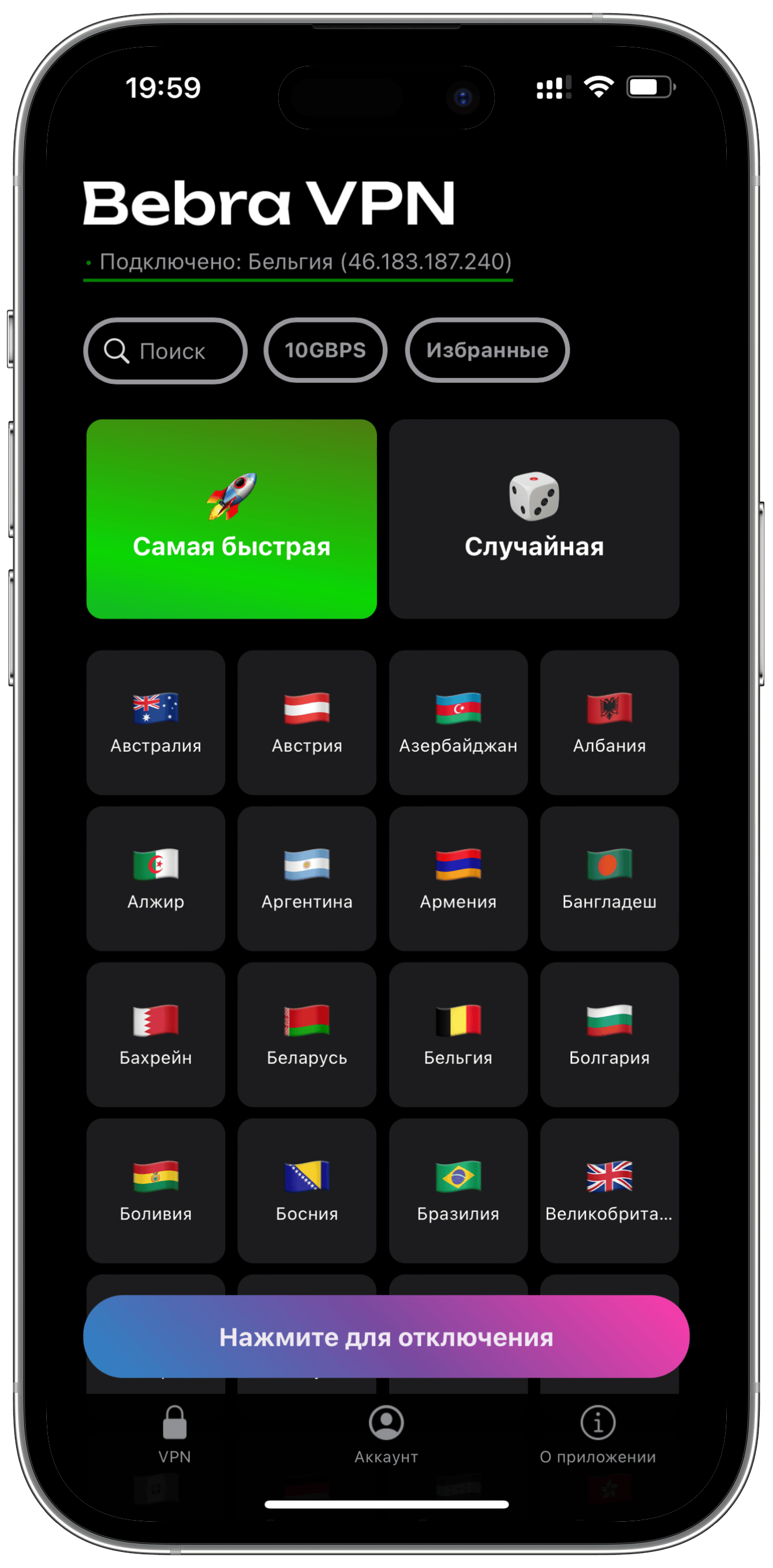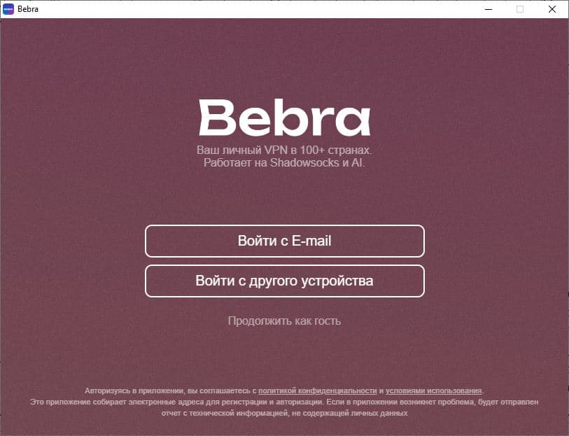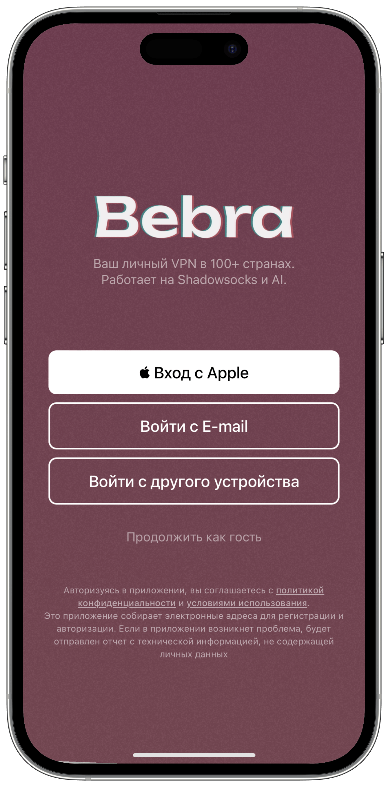 Компания Apple скрывает VPN-приложения для России и Китая. Это легко обойти, используя аккаунт App Store других регионов. Для пользователей Бебры из России и Китая мы бесплатно предоставляем временный иностранный аккаунт App Store, чтобы вы могли скачать наше приложение на iPhone, iPad или macOS.