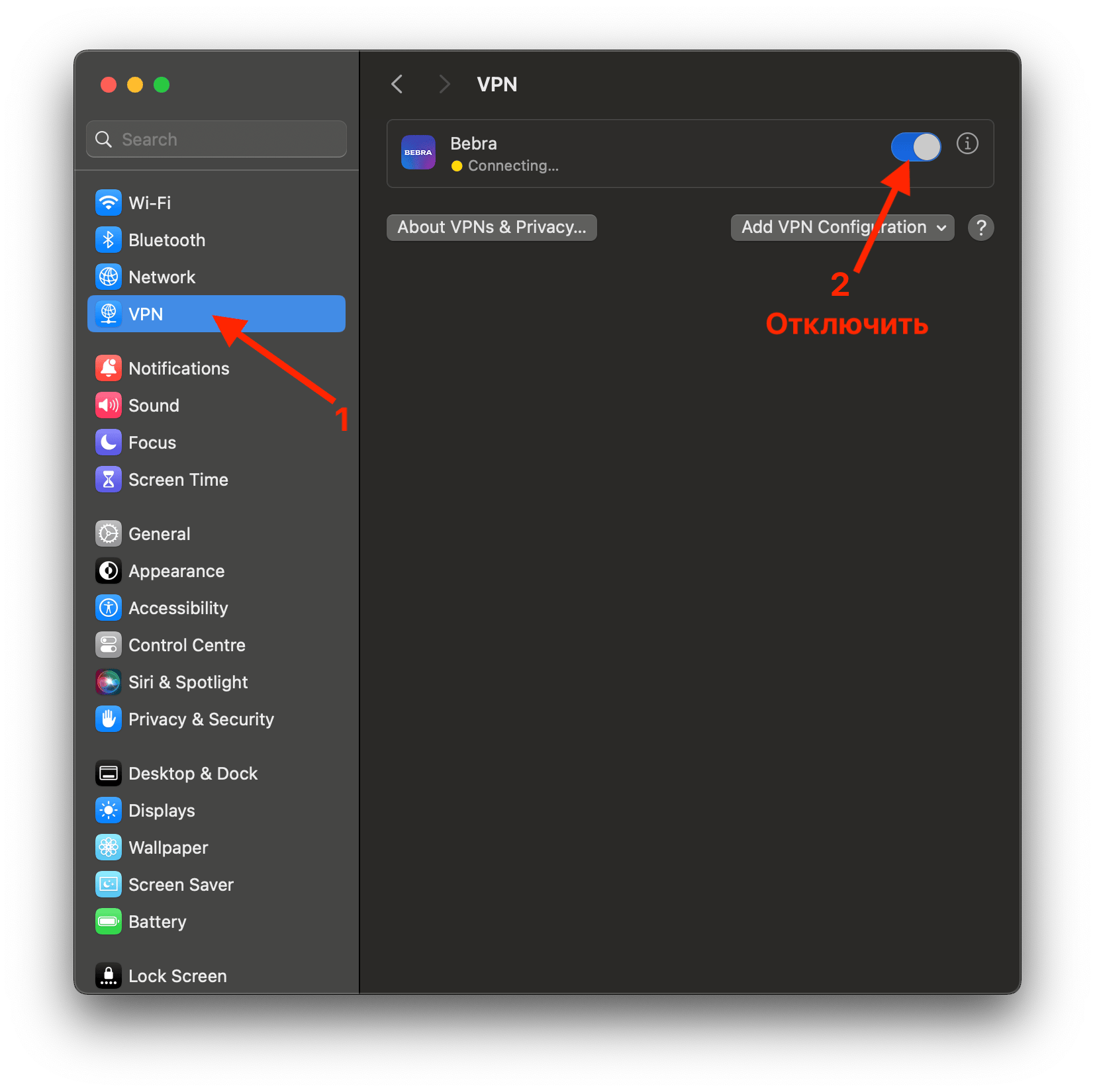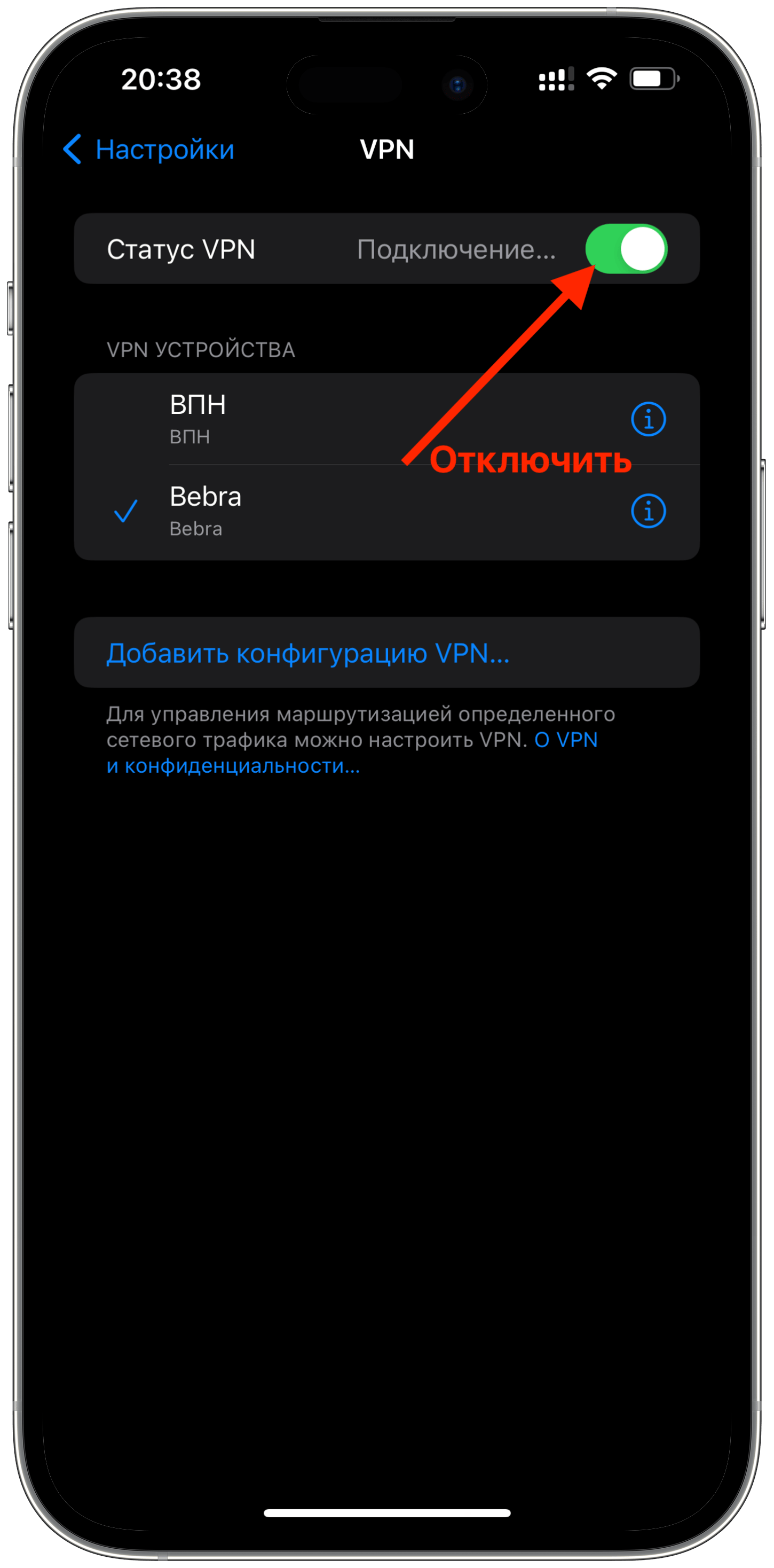 Если у вас в настройках VPN выбрано соединение Bebra, и его статус – "Подключение", то просто отключите переключатель VPN в настройках.