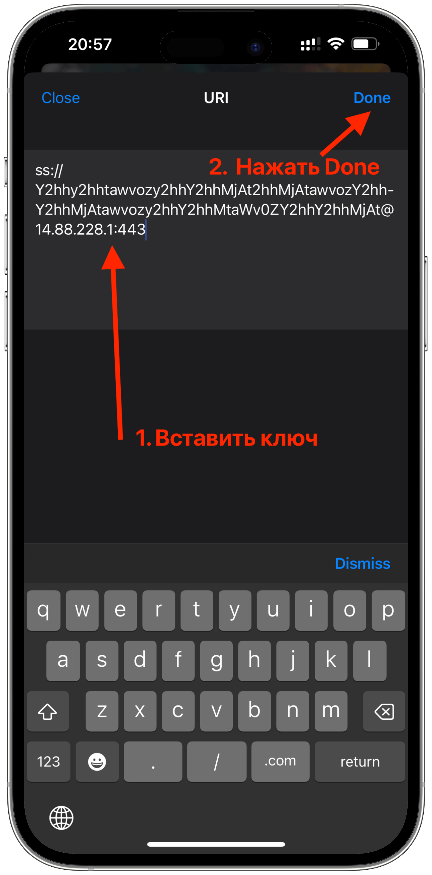 Сюда нужно вставить ss-ключ из личного кабинета и нажать "Done".