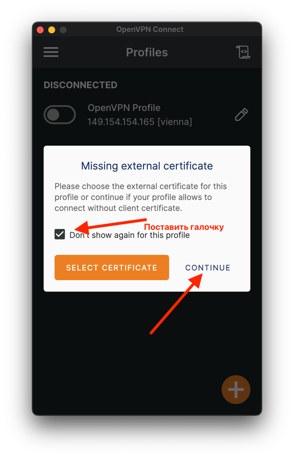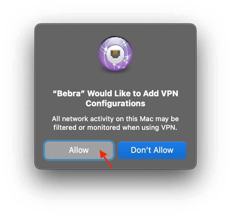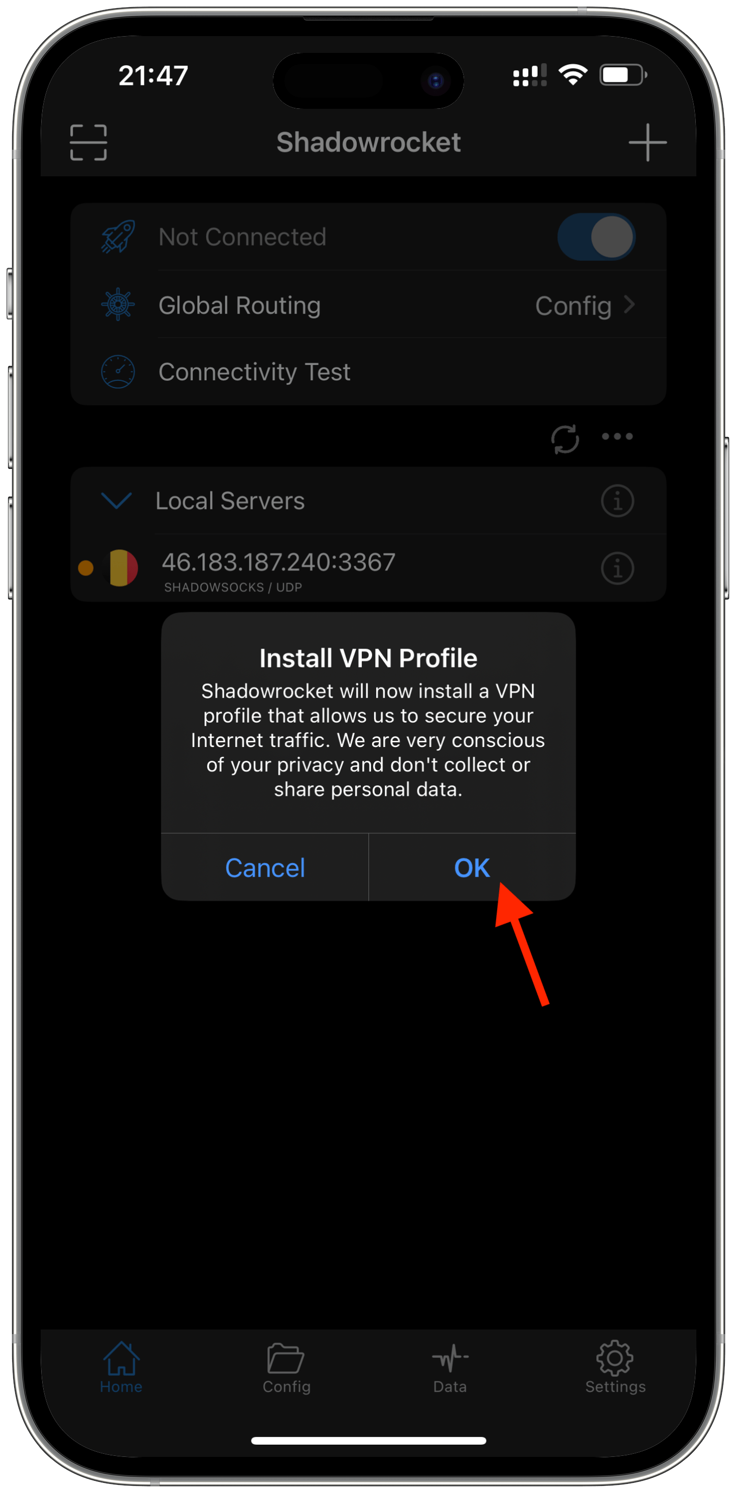 Начните подключаться к любому серверу. При первом подключении система запросит добавление нашего VPN профиля в систему.