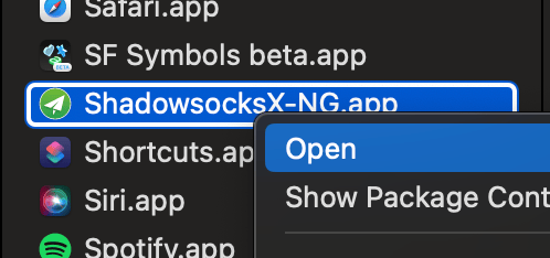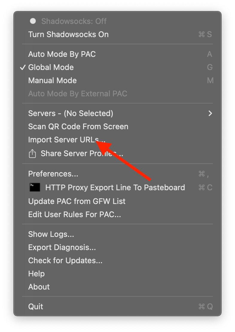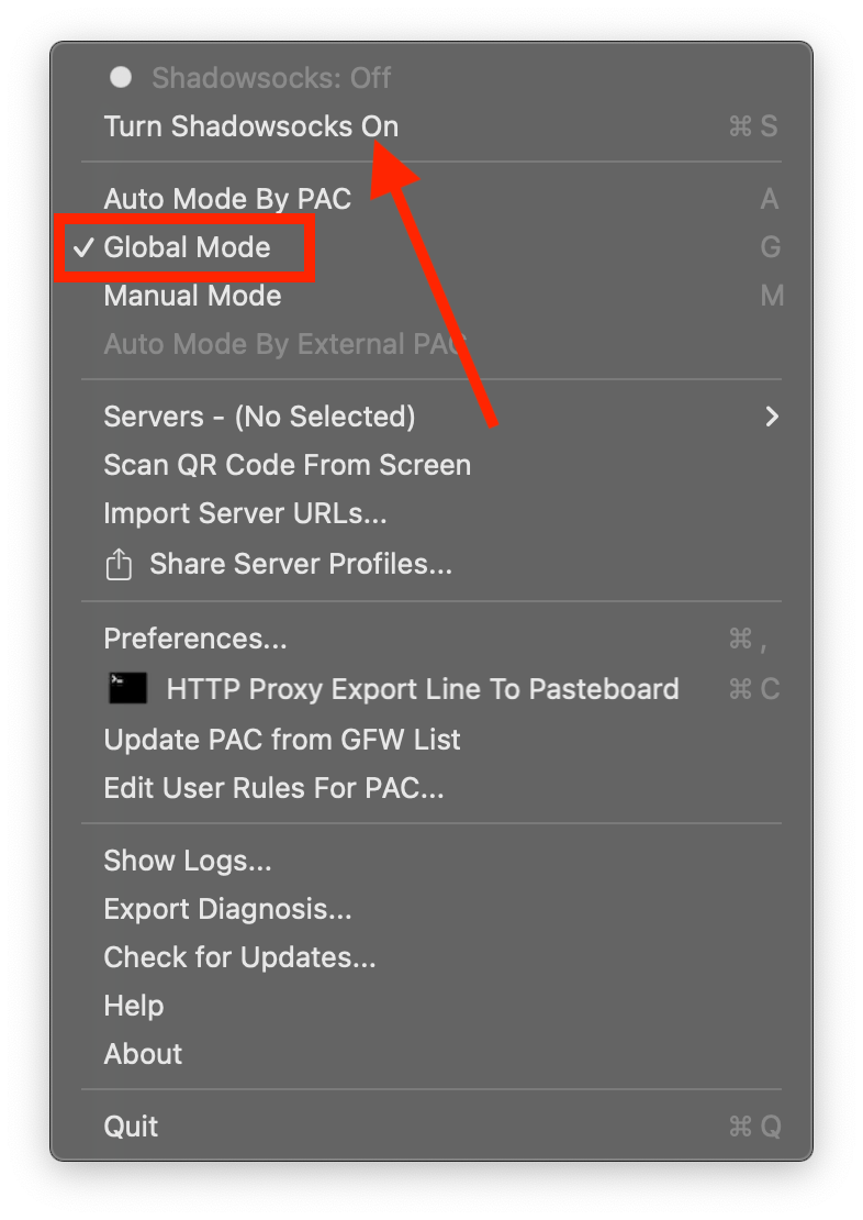 Проверьте, чтобы стояла галочка в пункте "Global", и нажмите "Turn Shadowsocks On".