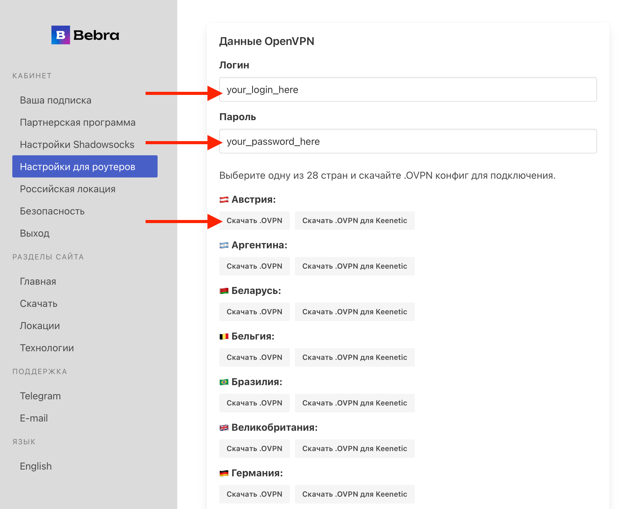 В личном кабинете в разделе "Настройки для роутеров" нажмите на кнопку "Получить настройки", а затем скачайте .OVPN файл от одной из локаций.