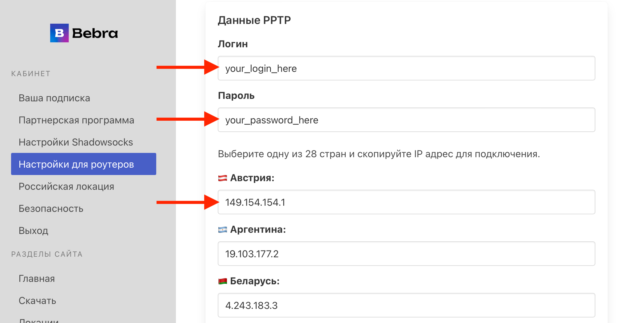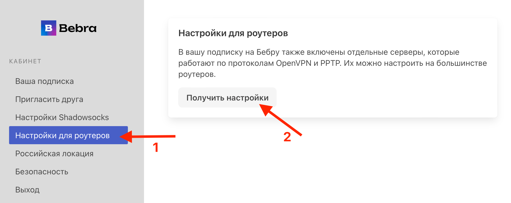 В Бебре мы предлагаем отдельные сервера для роутеров. Эти сервера работают на протоколах OpenVPN и PPTP. Они менее быстрые и надежные, чем протокол Shadowsocks, который используется в приложении Бебры, однако эти протоколы совместимы с большим количеством роутеров, представленных на рынке.