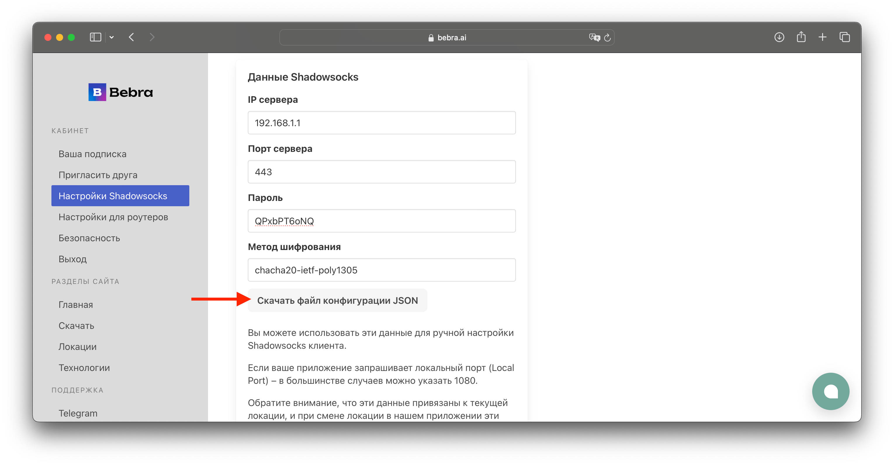 Зайдите в личный кабинет https://bebra.pw/dash и перейдите там в раздел "Настройки Shadowsocks".
