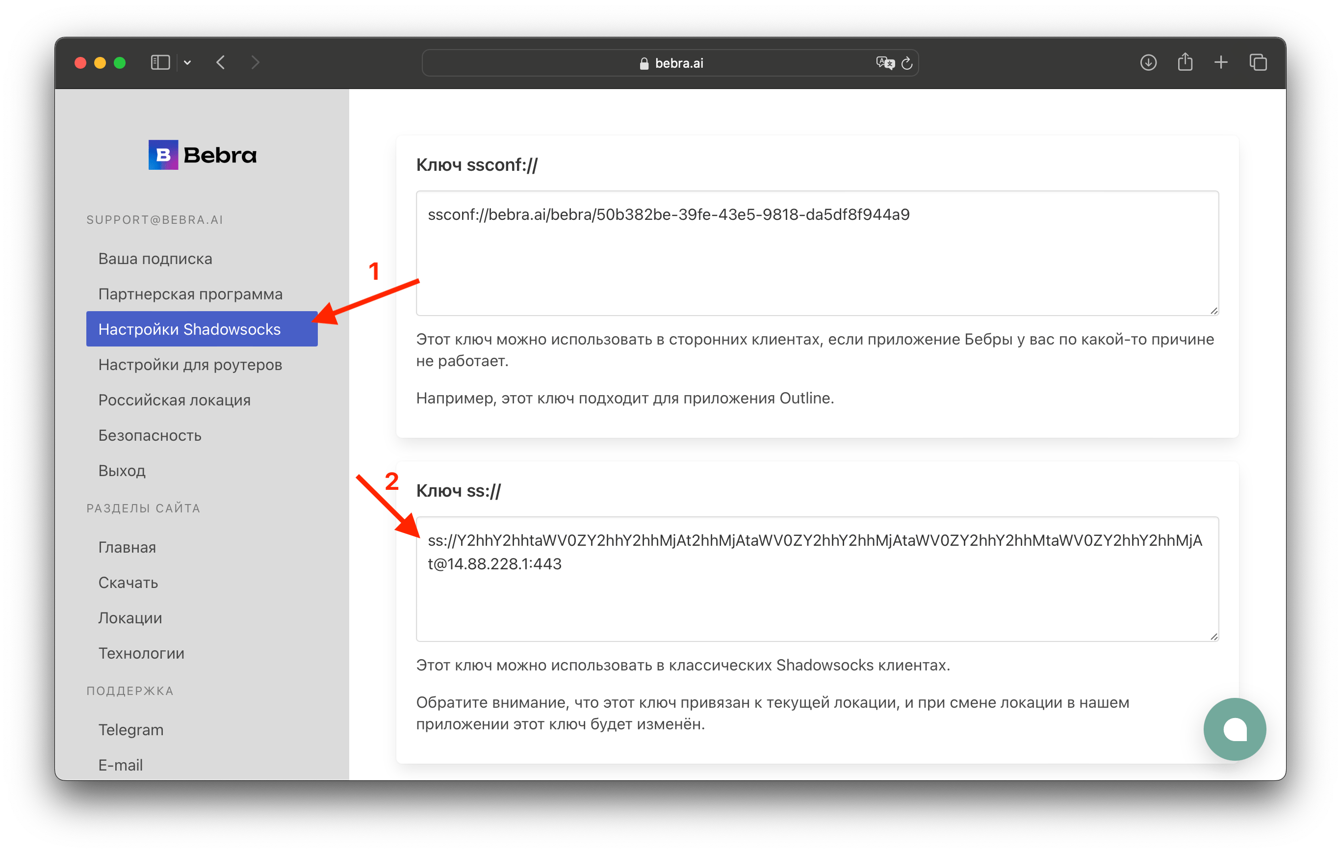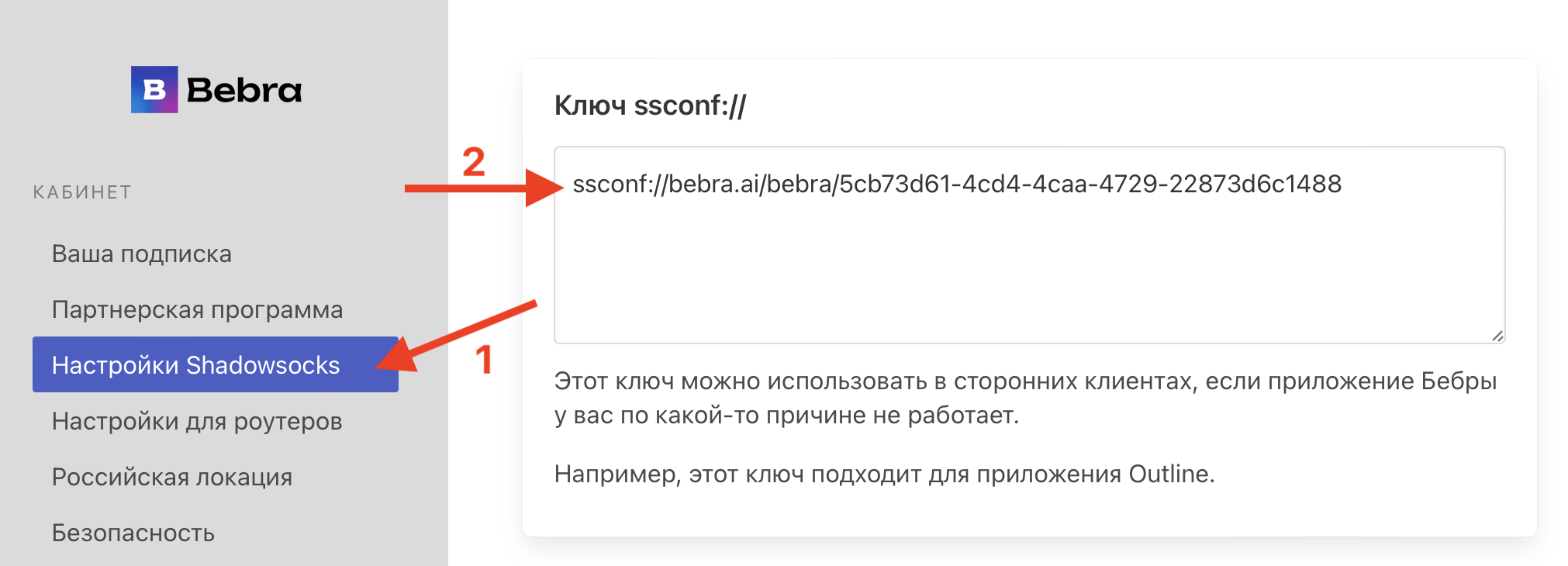 Обратите внимание, что в каждой VPN локации ключ разный. При смене локации через официальное приложение Бебры ваш ss-ключ перестанет работать. Поэтому лучше всего не менять локацию после того, как вы настроите подключение через сторонний клиент.