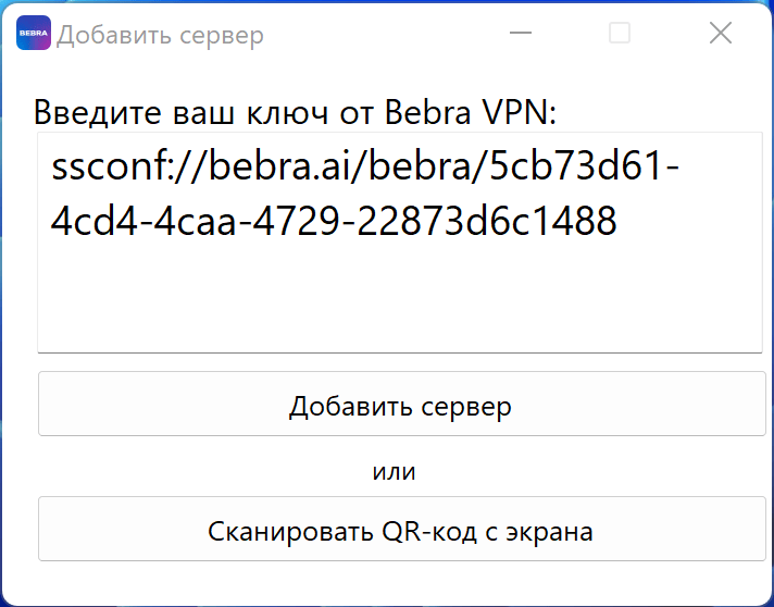 Вставьте ваш ssconf-ключ в окне добавления ключа, и нажмите кнопку "Добавить сервер".