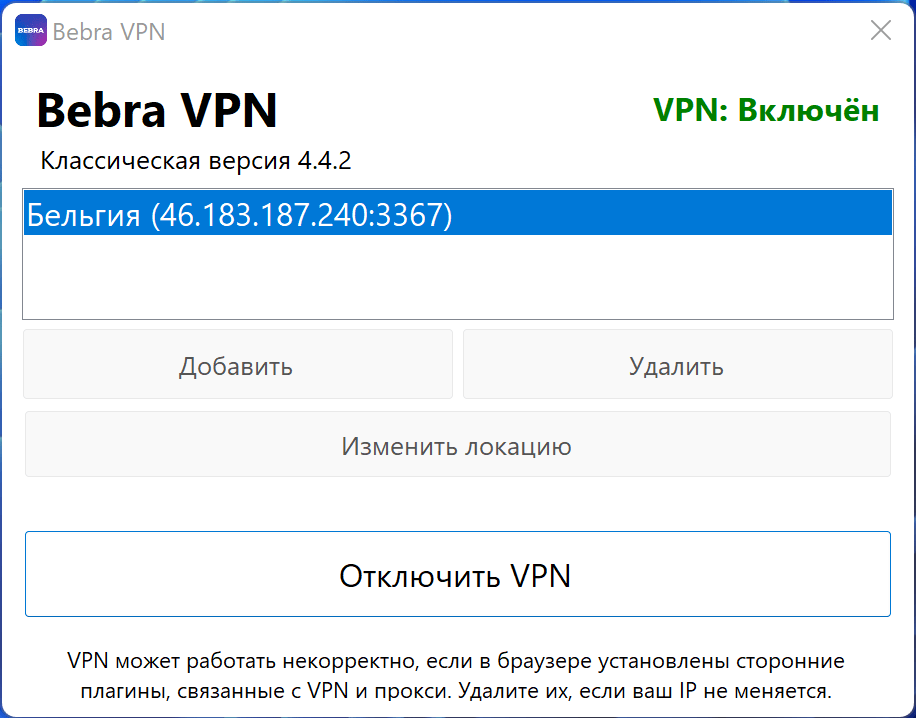 Дело в том, что классический клиент работает как локальный прокси-сервер, и прописывает в систему собственный адрес прокси. Если в браузере установлены другие VPN или прокси расширения – браузер будет вместо системного прокси-сервера использовать настройки из этих расширений. Даже если вы в таком расширении просто отключите VPN или прокси – браузер будет считать, что не нужно использовать прокси вообще. Поэтому важно именно удалить такие расширения из браузера.